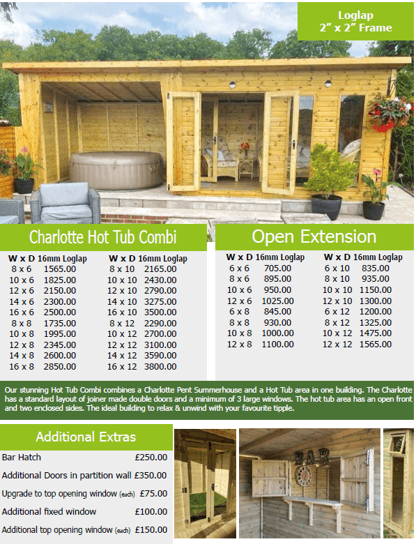 The price above reflects a 14′ x 8′ Hot Tub Combi (8′ x 8′ Summerhouse plus an 6 ‘ x 8’ canopy.) Please email or phone for size and price options.